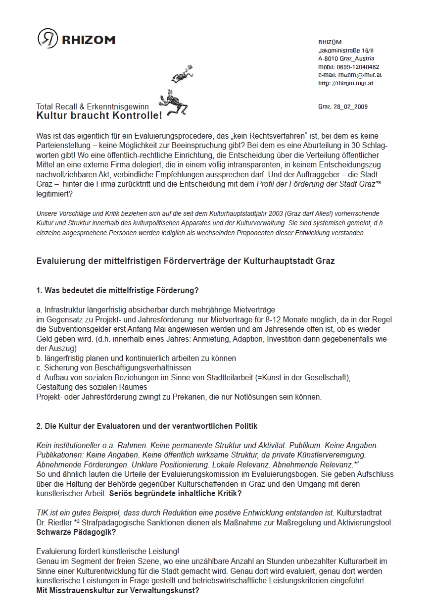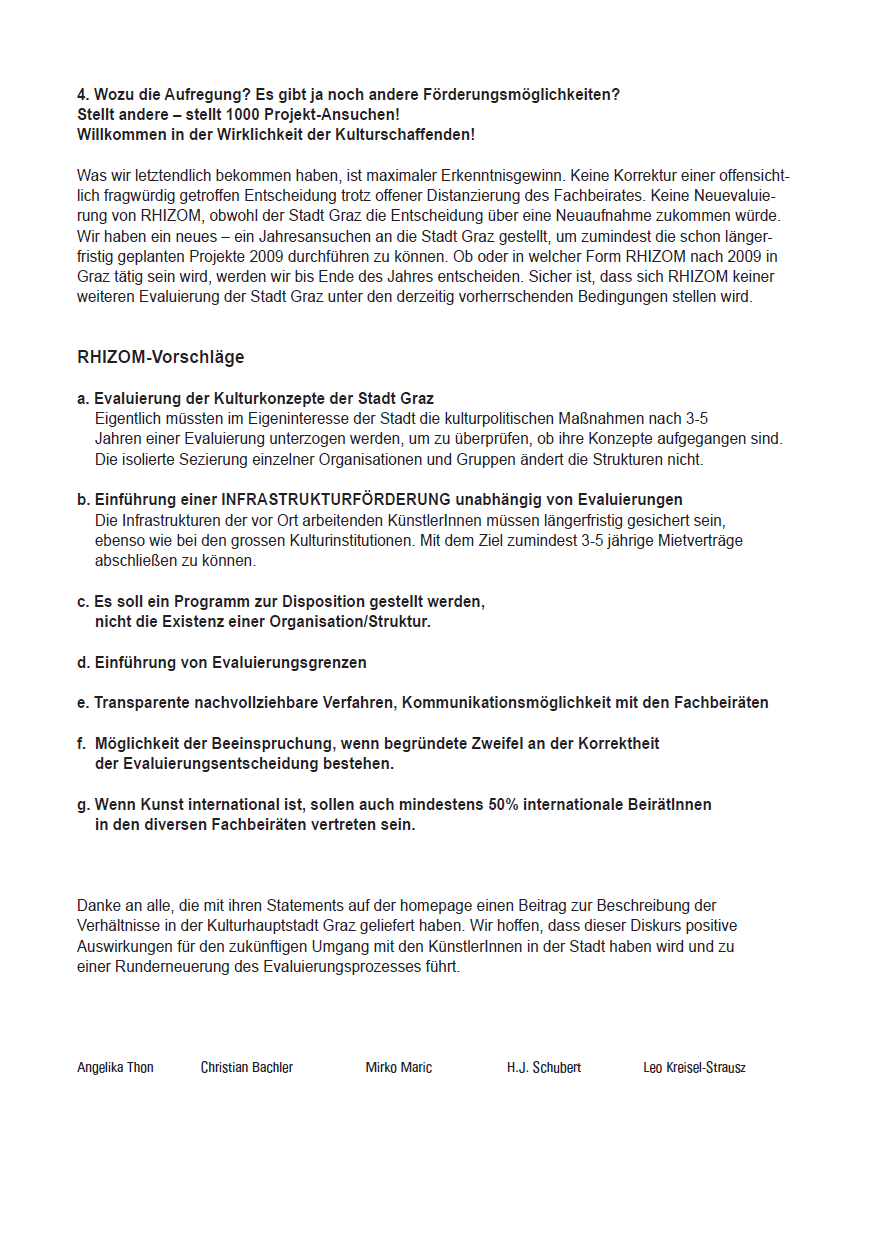 Was wir letztendlich bekommen haben, ist maximaler Erkenntnisgewinn. Keine Korrektur einer offensichtlich fragwürdig getroffen Entscheidung trotz offener Distanzierung des Fachbeirates. Keine Neuevaluierung von RHIZOM, obwohl der Stadt Graz die Entscheidung über eine Neuaufnahme zukommen würde. Wir haben ein neues – ein Jahresansuchen an die Stadt Graz gestellt, um zumindest die schon längerfristig geplanten Projekte 2009 durchführen zu können. Ob oder in welcher Form RHIZOM nach 2009 in Graz tätig sein wird, werden wir bis Ende des Jahres entscheiden. Sicher ist, dass sich RHIZOM keiner weiteren Evaluierung der Stadt Graz unter den derzeitig vorherrschenden Bedingungen stellen wird.