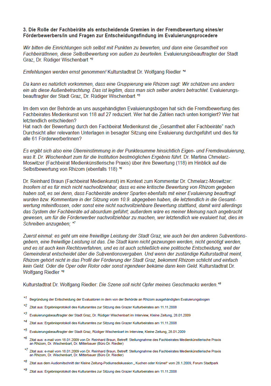 Dr. Reinhard Braun (Fachbeirat Medienkunst) im Kontext zum Kommentar Dr. Chmelarz-Moswitzer: Insofern ist es für mich nicht nachvollziehbar, dass es eine kritische Bewertung von Rhizom gegeben haben soll, es sei denn, dass Fachbeiräte anderer Sparten ebenfalls mit einer Evaluierung beauftragt wurden bzw. Kommentare in der Sitzung vom 10.9. abgegeben haben, die letztendlich in die Gesamtwertung miteinflossen, oder sonst eine nicht nachvollziehbare Bewertung stattfand, damit wird allerdings das System der Fachbeiräte ad absurdum geführt; außerdem wäre es meiner Meinung nach angebracht gewesen, um für die Förderwerber nachvollziehbar zu machen, wer letztendlich wie evaluiert hat, dies im Schreiben anzugeben; *7