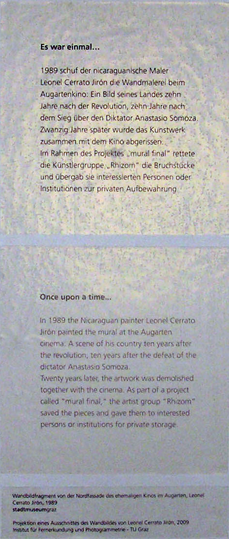 1989 schuf der nicaraguanische Maler Leonel Cerrato Jirón die Wandmalerei beim Augartenkino. Ein Bild seines Landes zehn Jahre nach der Revolution, zehn Jahre nach dem Sieg über den Diktator Anastasio Somoza. Zwanzig Jahre später wurde das Kunstwerk zusammen mit dem Kino abgerissen. Im Rahmen des Projektes „mural final“ rettete die Künstlergruppe „Rhizom“ die Bruchstücke und übergab sie interessierten Personen oder Institutionen zur privaten Aufbewahrung.