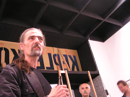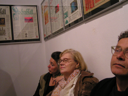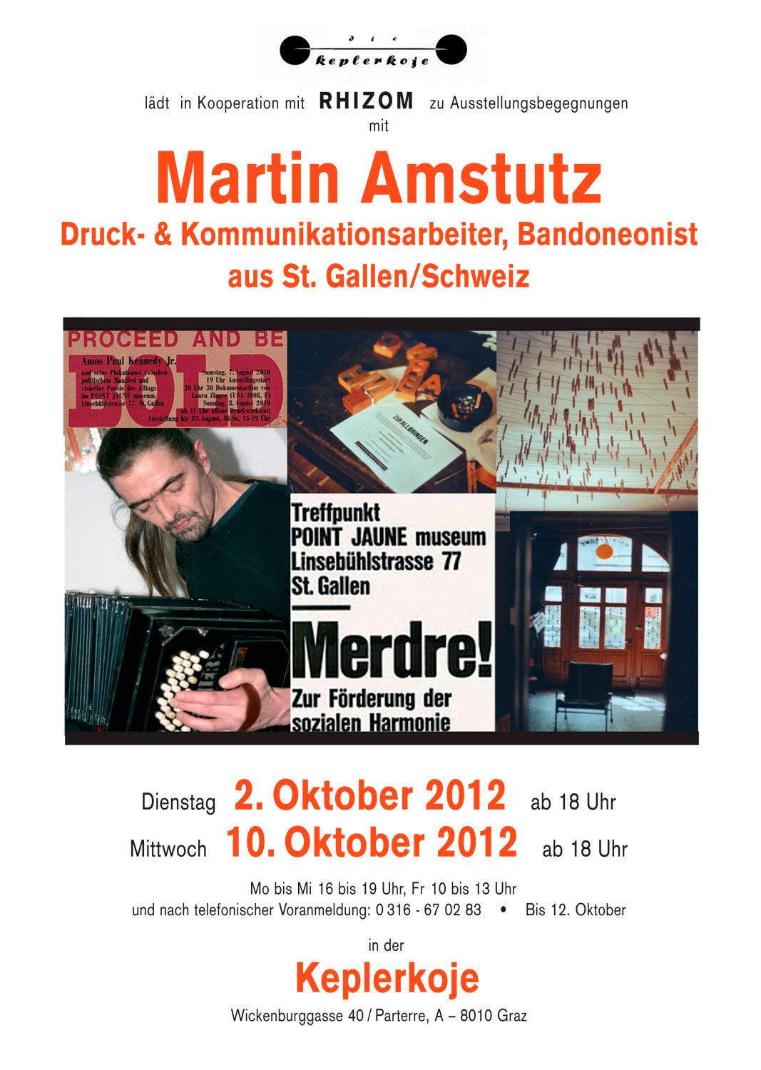 Amstutz und seine MitschreiterInnen, respektive Mme. Kaemo und Rosa Rhomberg, laden jeden Mittwochabend in die POSTPOST, wie das Werkstättenlokal außerdem heißt, zum gemeinsamen Arbeiten, Diskutieren, Relaxen, zu „Arbeit & Spiel“ (Iring Fetscher), eine etwas säkularisierte Variante des mönchischen „Ora et Labora“, die ja im schweizerischen St. Gallen ja durchaus – und nicht mager – auch praktiziert wird.