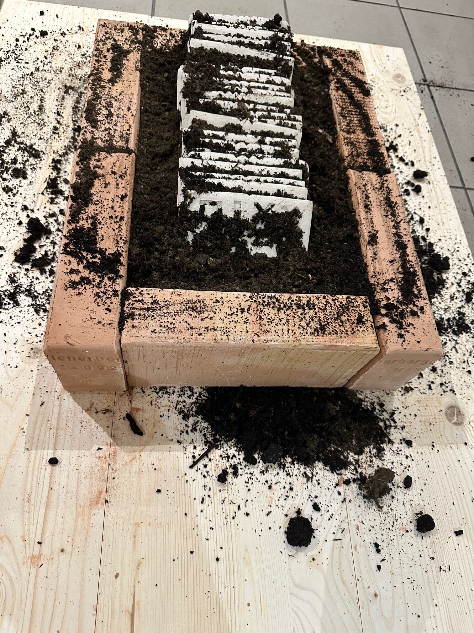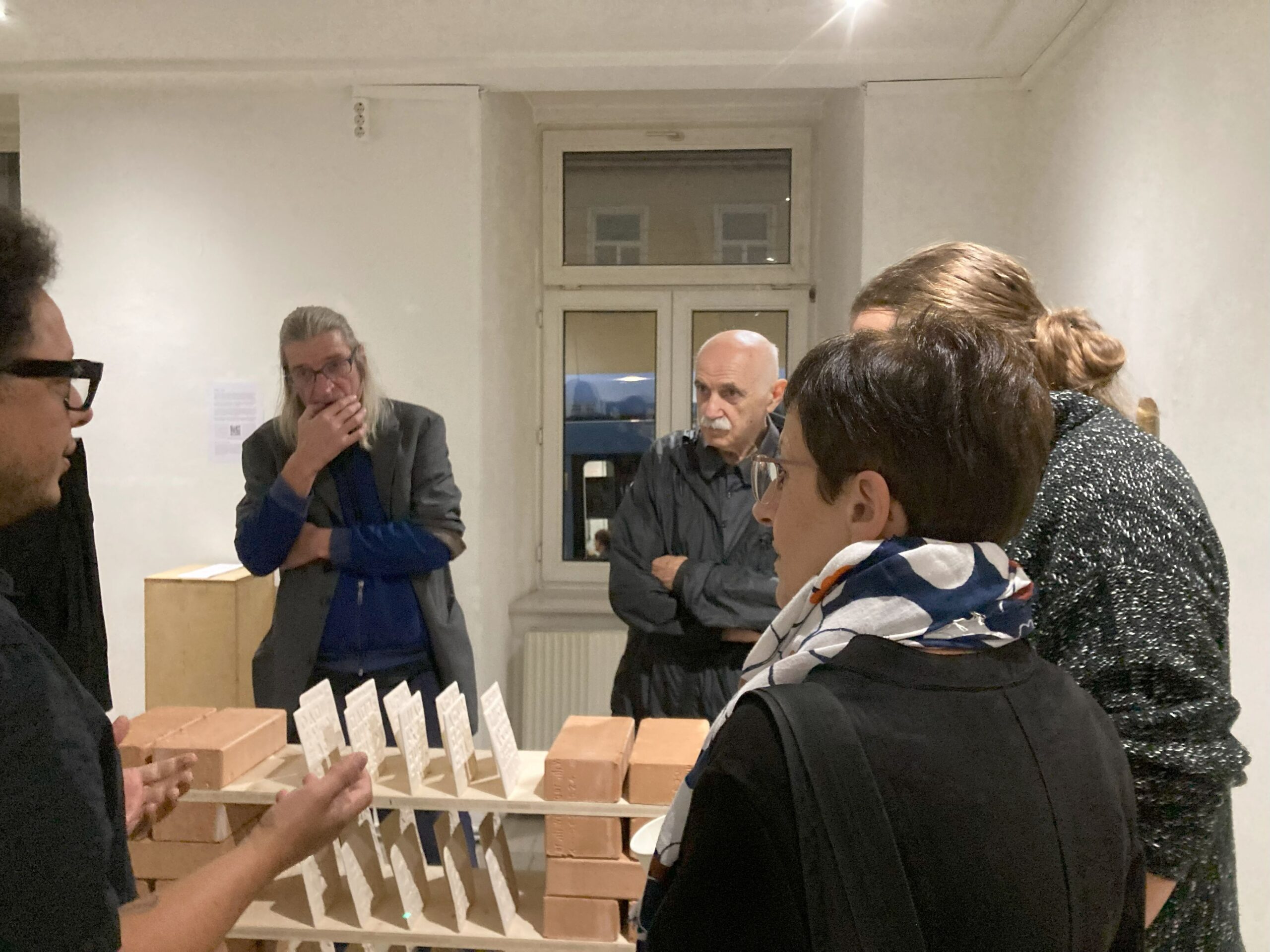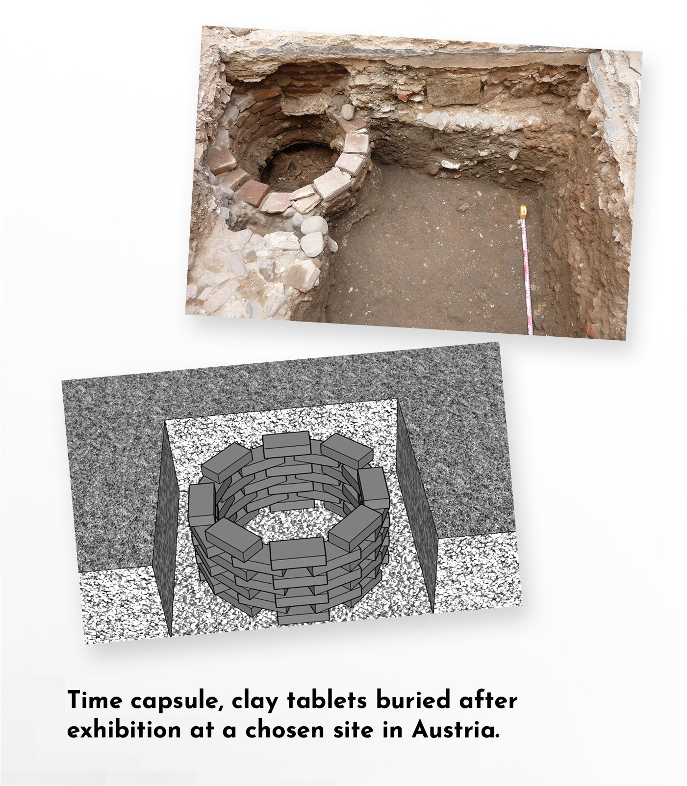 Mich interessiert die Anomalie, in Österreich – im Zentrum Europas – Tontafeln mit der Geschichte der zentralamerikanischen Kunst zu entdecken. So ergibt sich ein doppeltes Spiel: zum einen die Evidenz dieses Mikro-Universums beim Sichtbar-Werden im Ausstellungsraum, zum anderen die buchstäbliche Geste, die Tontafeln zum Abschluss der Ausstellung dem Erdreich zu übergeben. Das Werk wird zu einer Zeitkapsel, wobei der Akt über die Allegorie hinaus Teil des Prozesses selbst wird.